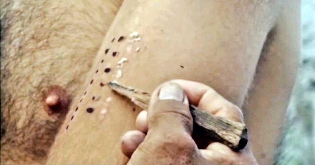 O aplicador, usando um titeba (um tipo de cipó ou palito fino) em brasa, abre pequenos pontos de queimadura superficial na primeira camada da pele, criando “portais”.